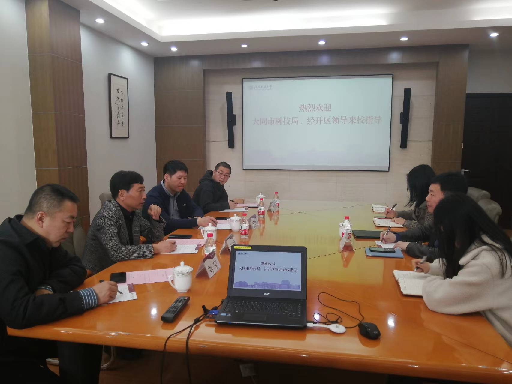 大同市科技局、经开区领导一行来yl6809永利线路检测调研,探讨学校的科研及科技成果情况。会议于2023年3月30日上午9:00在敦品楼304召开,会议由学校科技成果转化中心副主任肖珂主持。