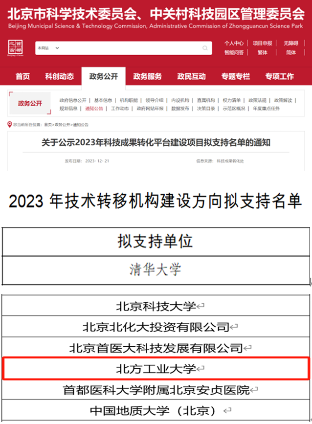 近日,北京市科学技术委员会、中关村科技园管理委员会公布了“2023年科技成果转化平台建设项目拟支持名单”,我校科技成果转化中心成功获批 “2023年技术转移机构建设方向”专项支持。